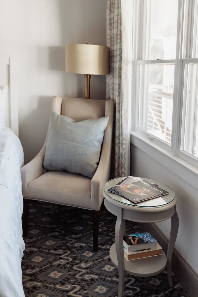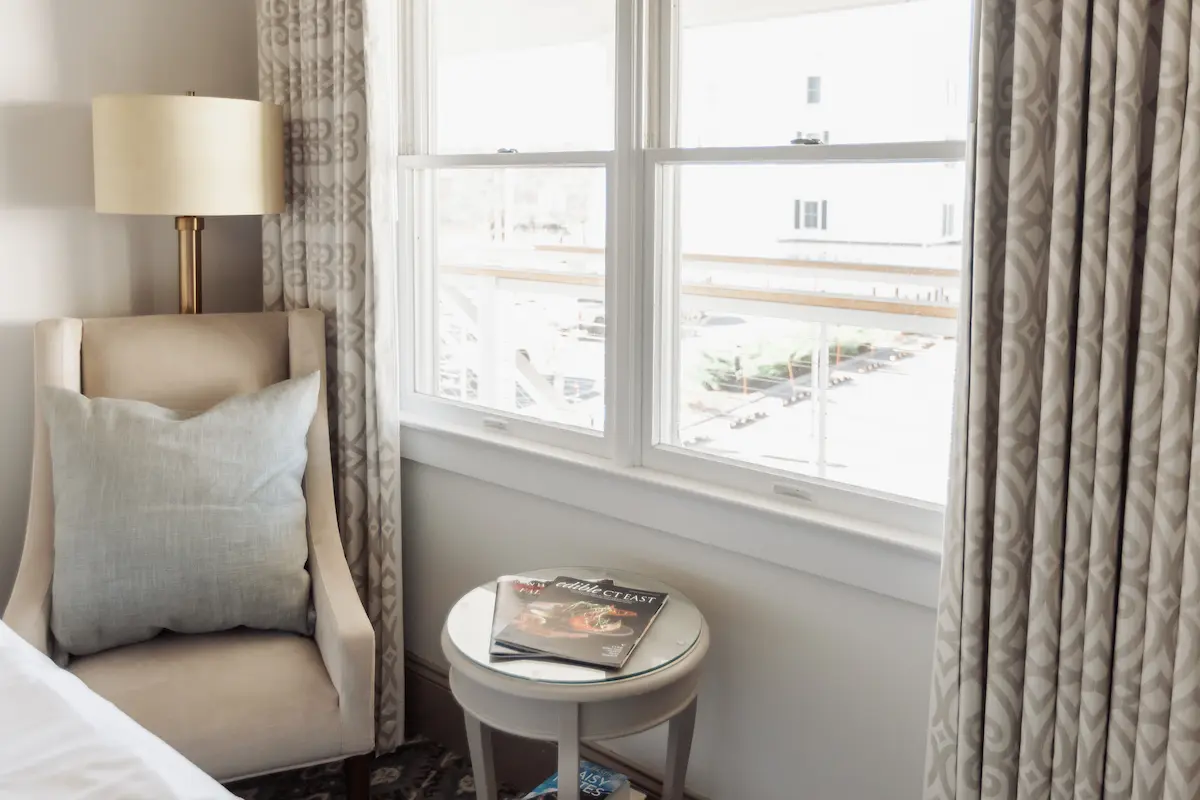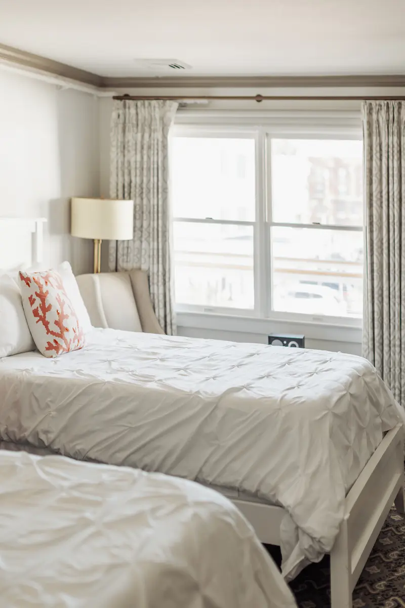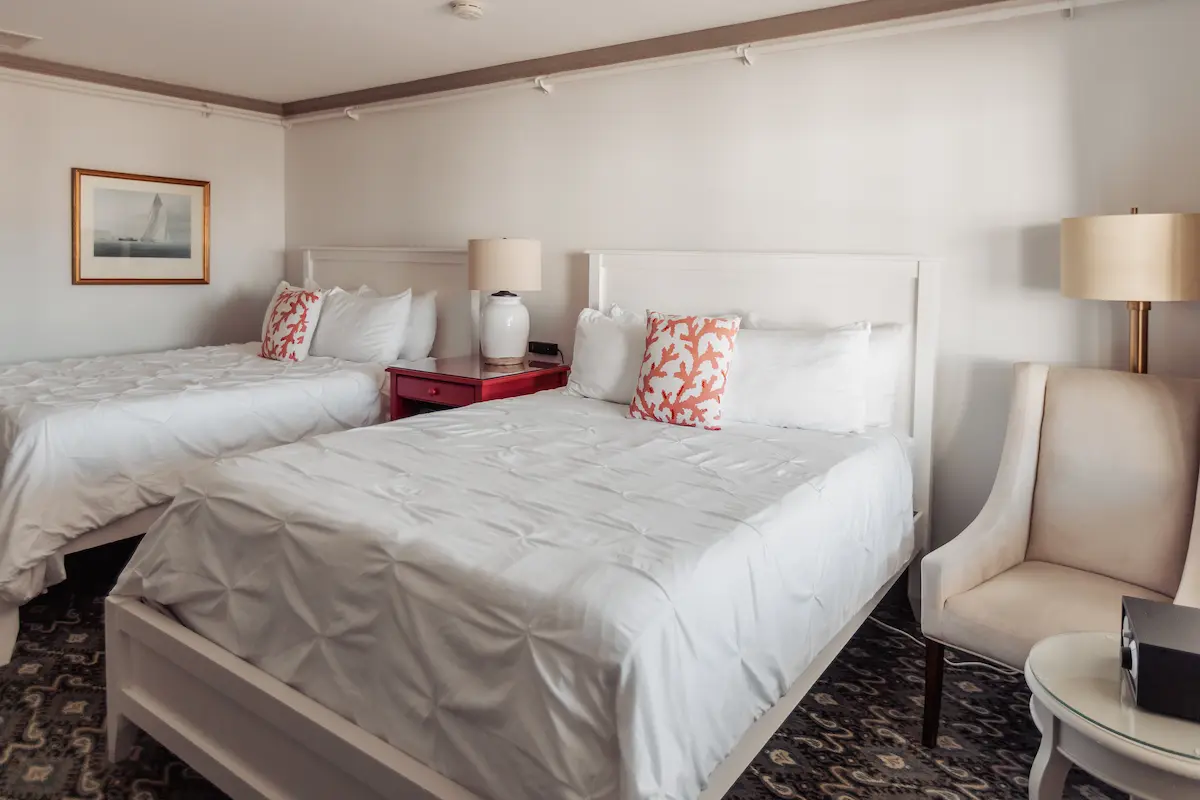 The Stonington House guestroom with two queen beds is a comfortable, coastal-style retreat designed for privacy and ease. With classic coastal chic décor and private exterior entrances, it is an inviting option for group getaways, family trips, or friends sharing a weekend in Mystic.