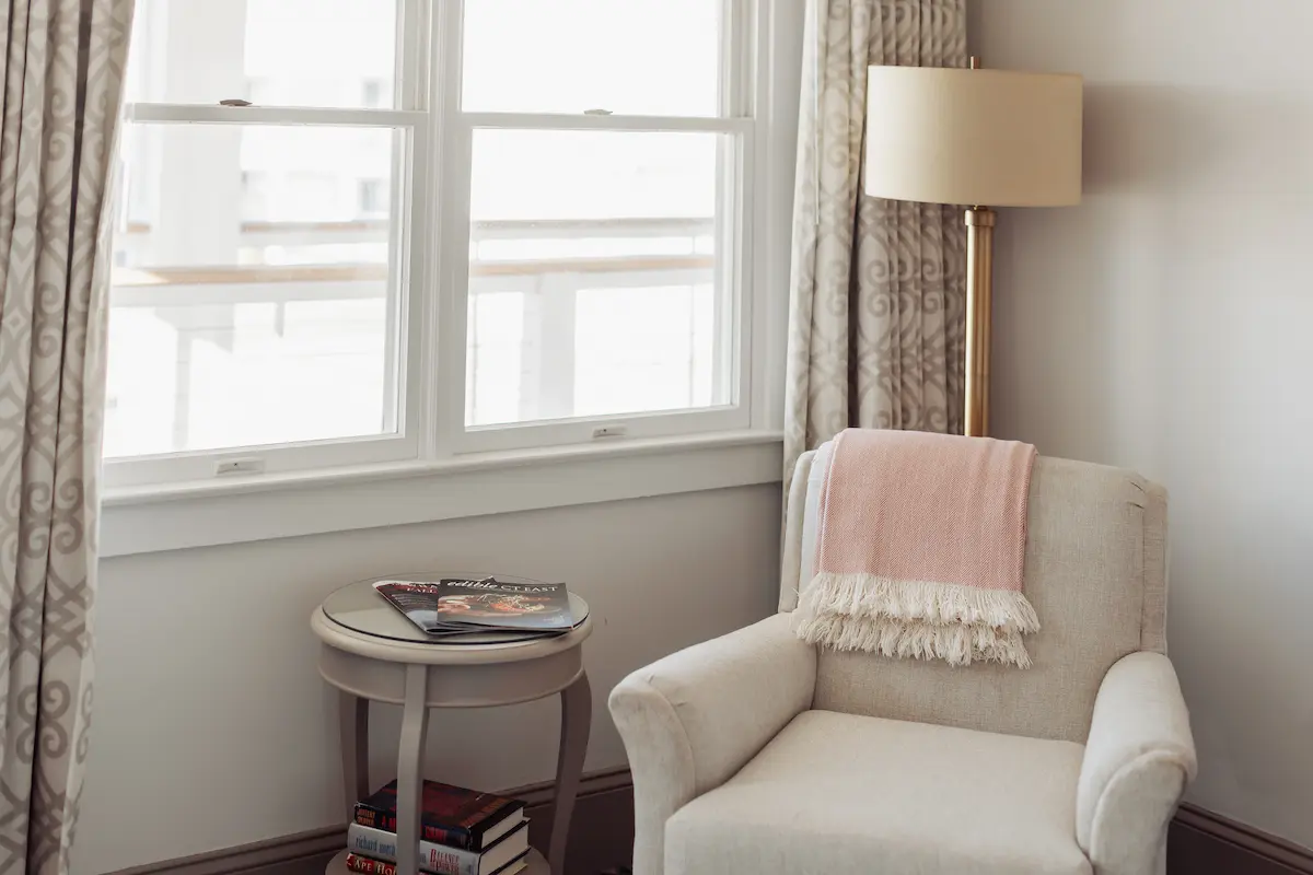 The shared porch is a favorite spot for morning coffee and quiet conversations, and inside, a cozy armchair invites you to settle in with a book or simply take a moment to slow down. With a calm, comfortable atmosphere throughout, it is an easy place to come back to after time downtown.