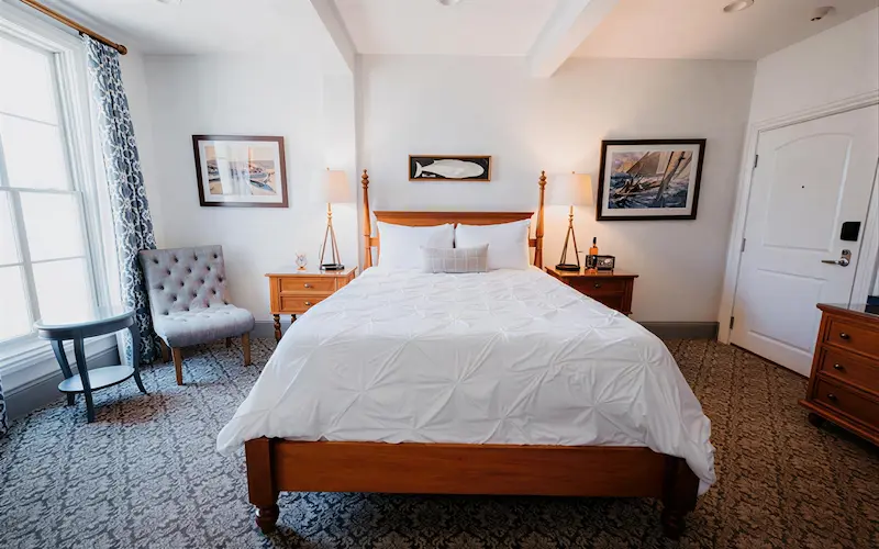 Oversized windows bring in natural light and invite moments of pause, whether reading in the upholstered side chair or taking in views of the surrounding streetscape. These rooms have a timeless sense of history about them and feel authentic, comfortable, and exactly what you want in your Mystic getaways.